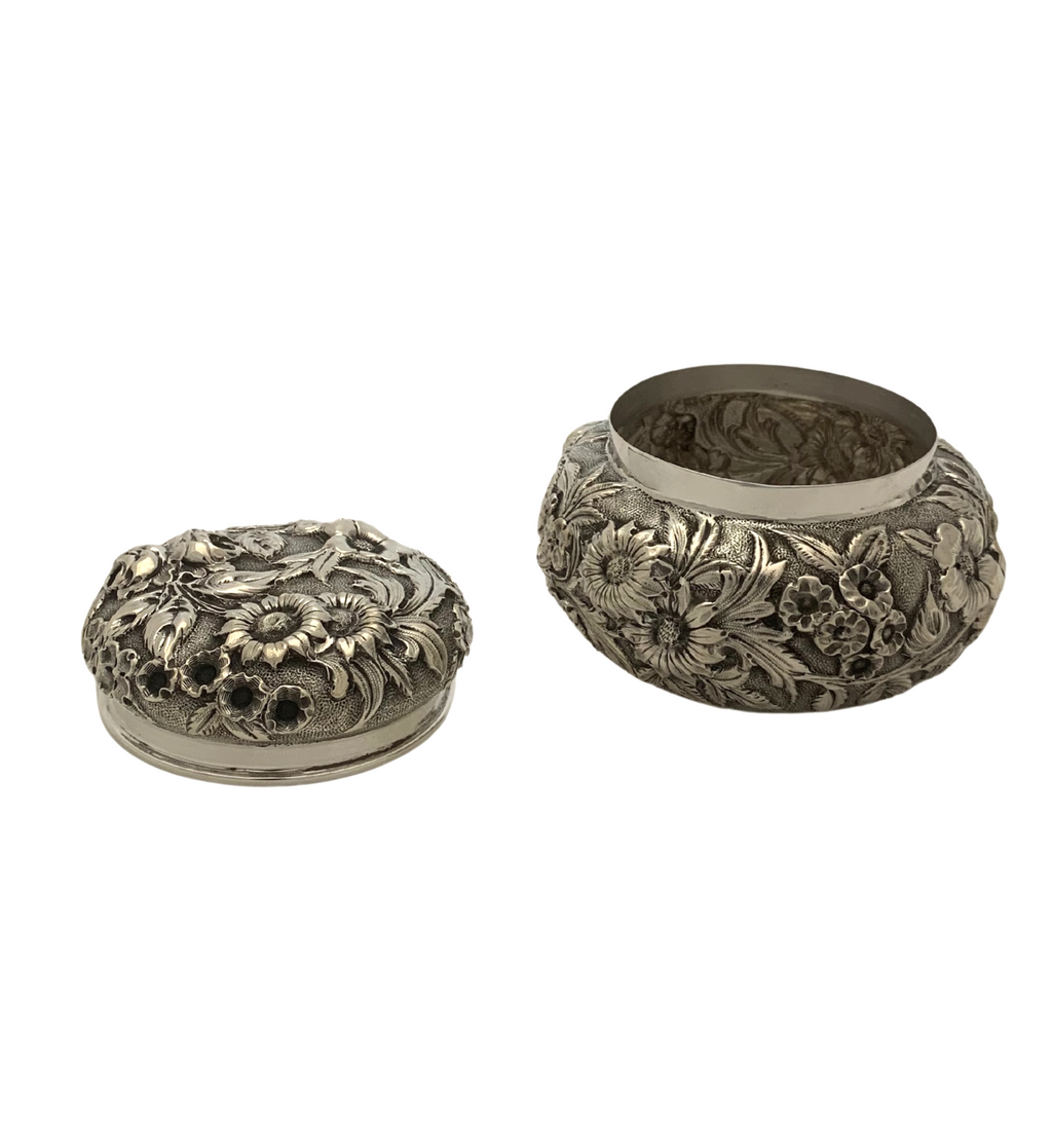 ANTIQUE JENKINS & JENKINS 925 STERLING SILVER HANDMADE FLORAL REPOUSSE ROUND BOX
