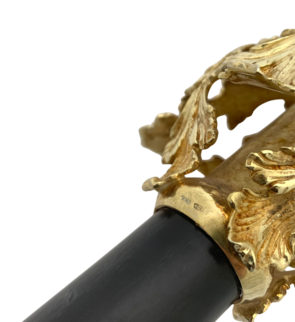 ITALIAN 925 STERLING SILVER & GILDED & WOOD HANDMADE LEAF CHASED WALKING CANE