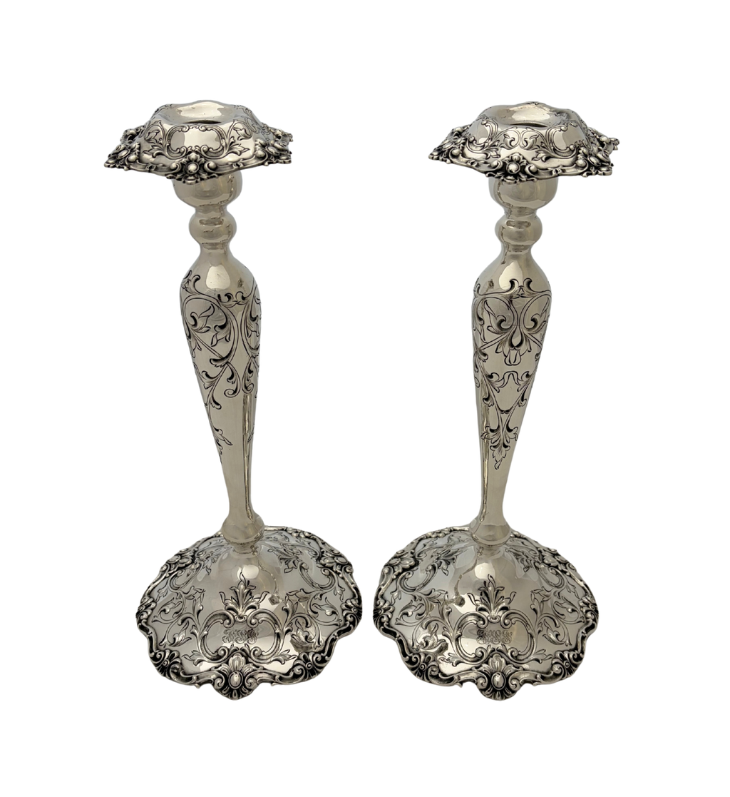 ANTIQUE SHREVE & CO 925 STERLING SILVER HANDMADE REPOUSSE SHINY CANDLESTICKS