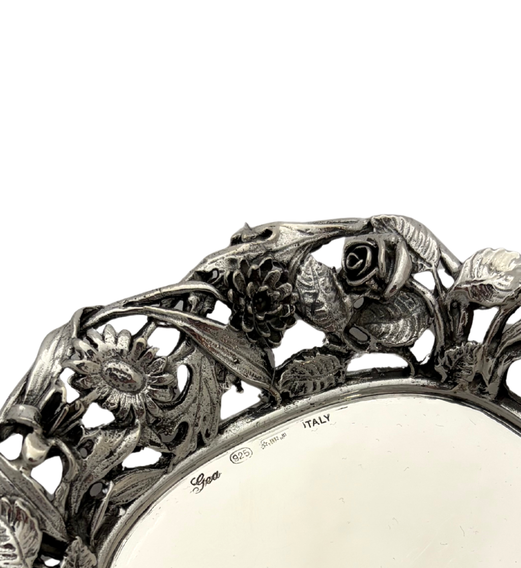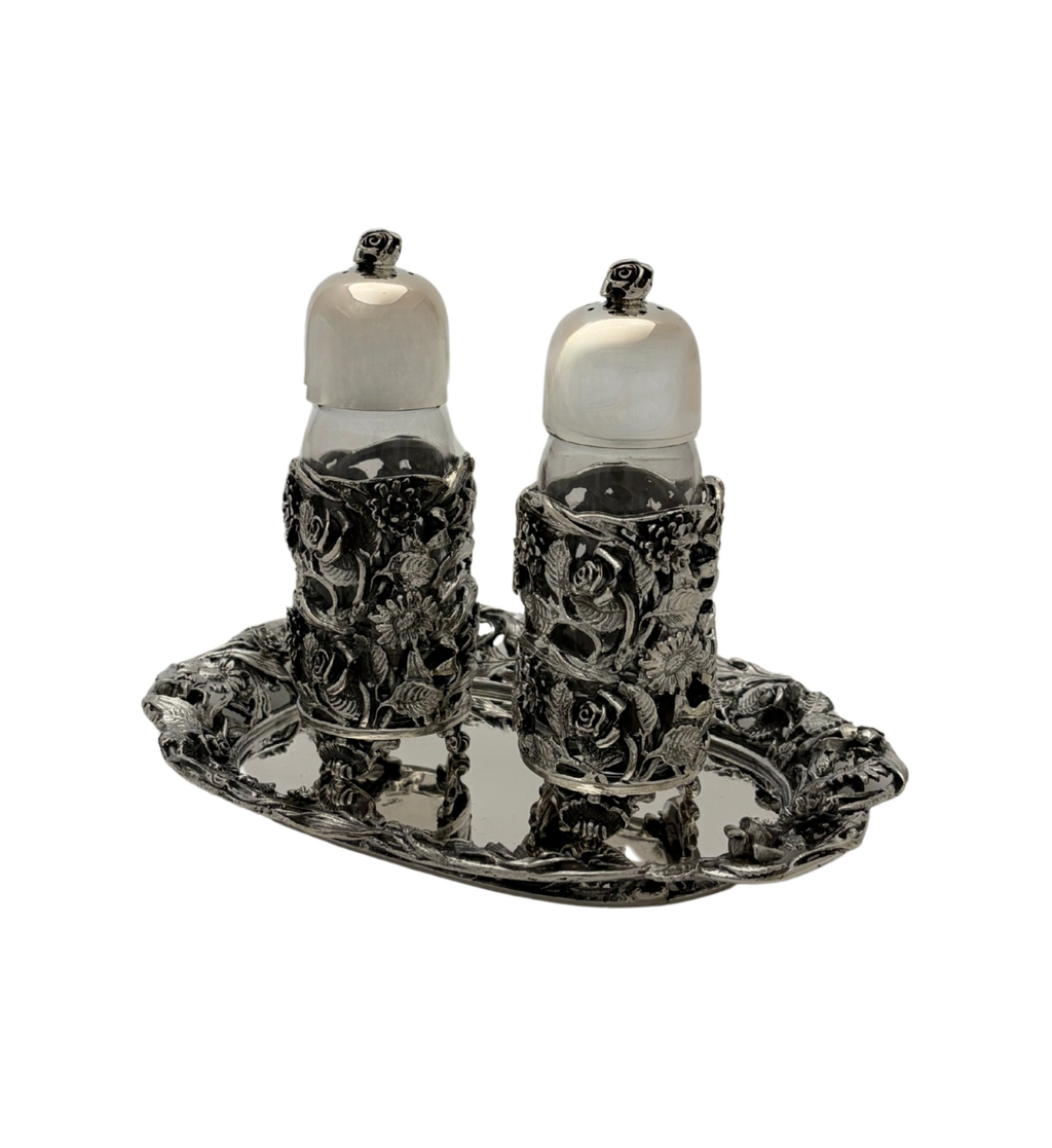 ITALY 925 STERLING SILVER HANDMADE FLORAL LEAF ORNATE SALT PEPPER SHAKER & TRAY